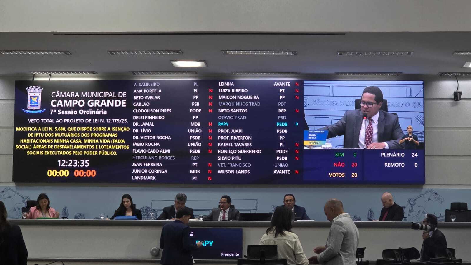 Os vereadores de Campo Grande derrubaram, nesta quinta-feira (26), com 20 votos favoráveis, o veto da prefeita Adriane Lopes (PP) ao projeto que amplia a faixa de isenção do IPTU (Imposto Predial e Territorial Urbano) para mutuários de programas habitacionais Minha Casa, Minha Vida (faixa social), áreas de desfavelamentos e loteamentos sociais.