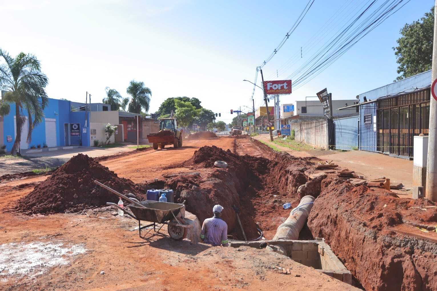 A Prefeitura de Campo Grande intensificou os trabalhos na Avenida Três Barras, no bairro Vilas Boas, aproveitando o tempo estável neste sábado. O trecho entre as ruas Domingos Jorge Velho e Miguel Sutil está interditado desde 14 de fevereiro. A obra visa solucionar problemas de acúmulo de água causados pelas enxurradas da Lagoa Itatiaia. Equipes iniciaram os trabalhos às 6h, com previsão de término às 17h. Desvios foram estabelecidos para garantir a fluidez do trânsito na região.